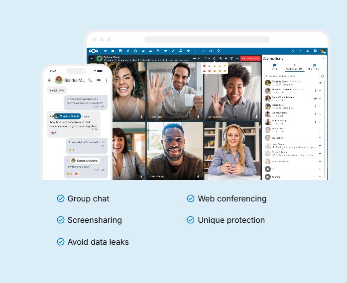 Nextcloud Talk permite colaborarea securizată sporind productivitatea si respectă confidențialitatea pentru colaborare online prin întâlniri, chat și webinarii. Nextcloud Talk vă protejează comunicarea mai bine decât alte platforme de colaborare…
